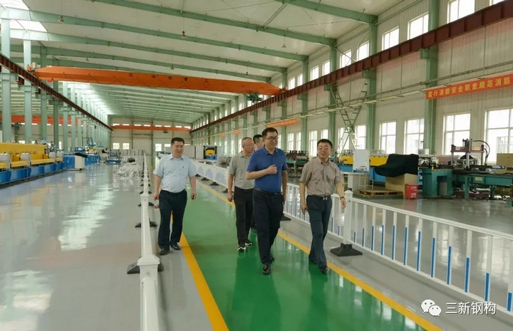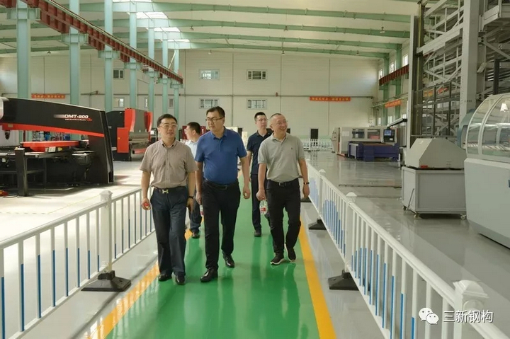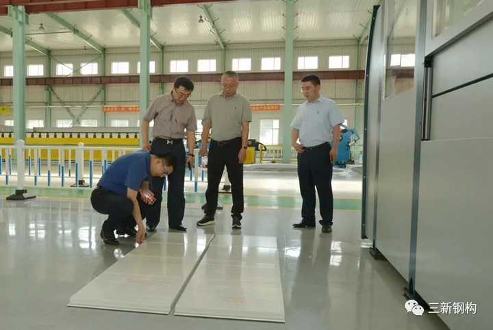 省廳領導在公司總經理洪長禧的陪同下參觀了公司裝配式建筑及幕墻生產基地和生產線,并對三新裝配式建筑實體模型和部品進行了詳細的了解。曹廳長、王處長對三新裝配式鋼結構建筑體系及先進的生產裝備給予了高度的評價,認為產品設計理念、制作工藝、安裝水平達到國內領先。