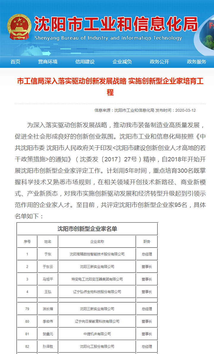2020年03月12日,于東云董事長、洪長禧總經理被沈陽市經信委授予2019年度沈陽市創新型企業家稱號。這是對我公司一直以來實施創新戰略成果的肯定,也是對于總和洪總領導下以設計研發人員和技術人員為代表的全體員工創新精神的褒獎!