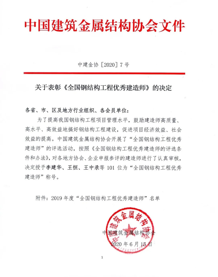 2020年6月15日,中國(guó)建筑金屬結(jié)構(gòu)協(xié)會(huì)組織的“全國(guó)鋼結(jié)構(gòu)工程優(yōu)秀建造師”評(píng)選活動(dòng)結(jié)果揭曉,李建華、王恒、王中錄等101位被評(píng)為“全國(guó)鋼結(jié)構(gòu)工程優(yōu)秀建造師”稱號(hào)。我公司李青山位列其中。李青山主持施工的“黃帝問(wèn)道大型城雕項(xiàng)目”榮獲“中國(guó)鋼結(jié)構(gòu)金獎(jiǎng)”工程。