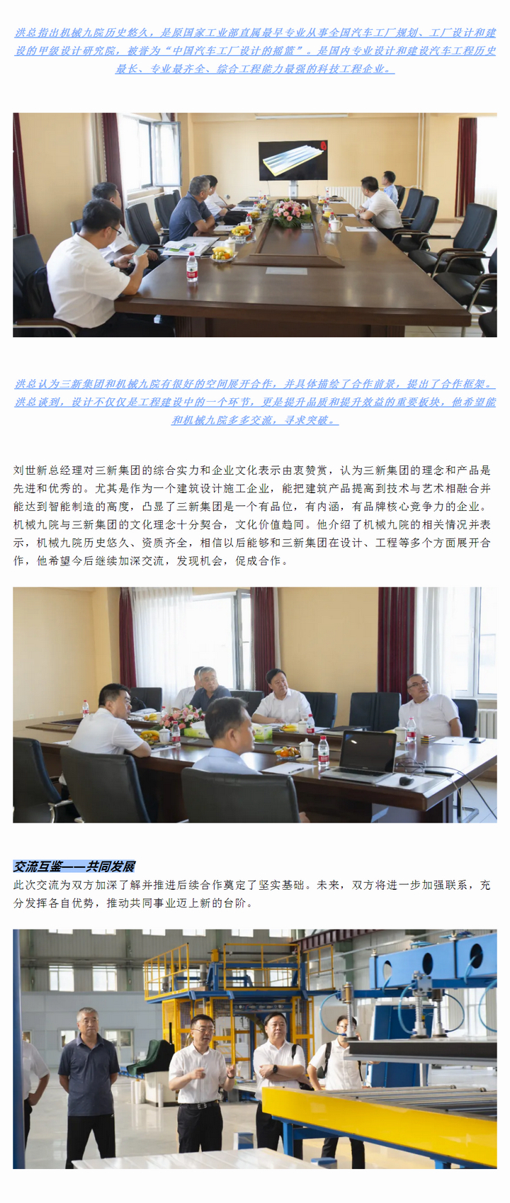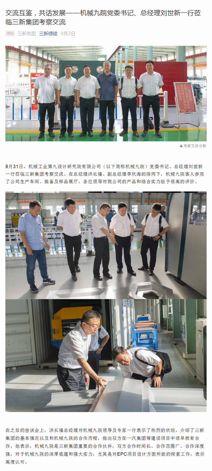 交流互鑒,共話發(fā)展——機(jī)械九院黨委書記、總經(jīng)理劉世新一行蒞臨三新集團(tuán)考察交流