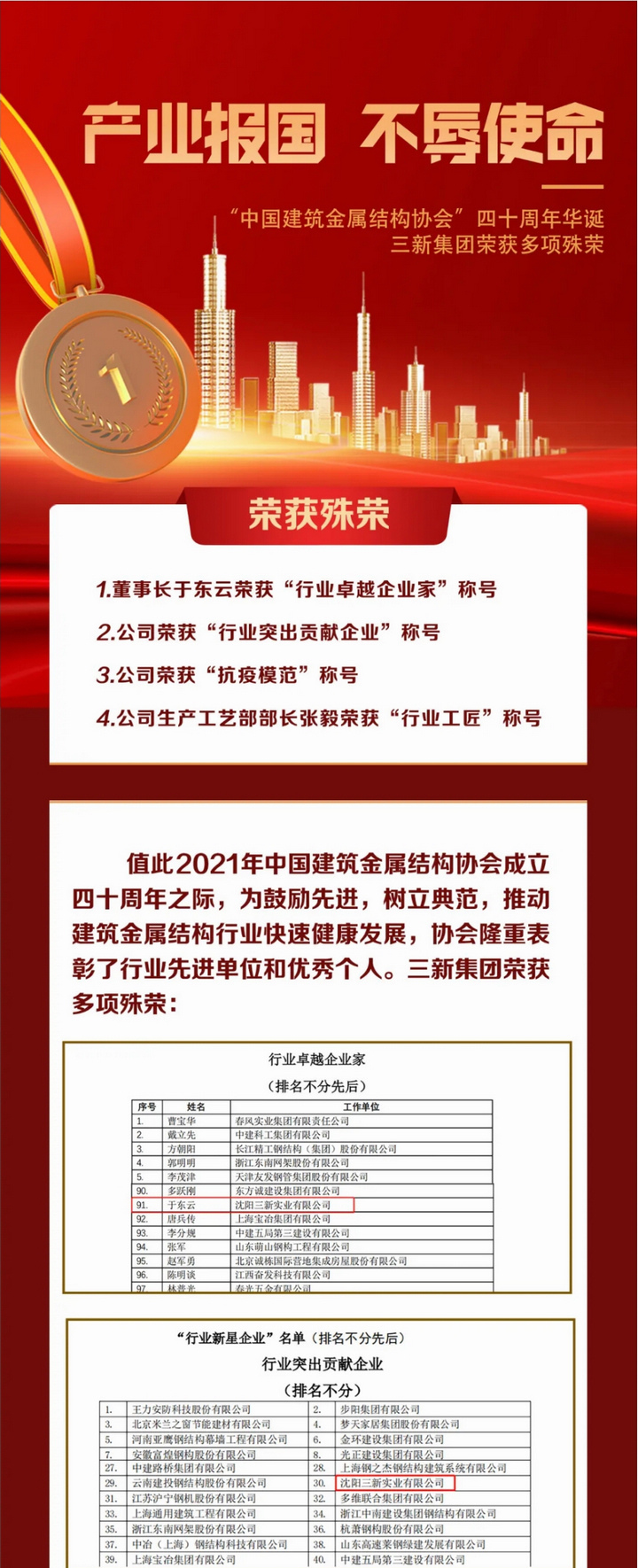 產(chǎn)業(yè)報國 不辱使命——“中國建筑金屬結(jié)構(gòu)協(xié)會”四十周年華誕,三新集團榮獲多項殊榮