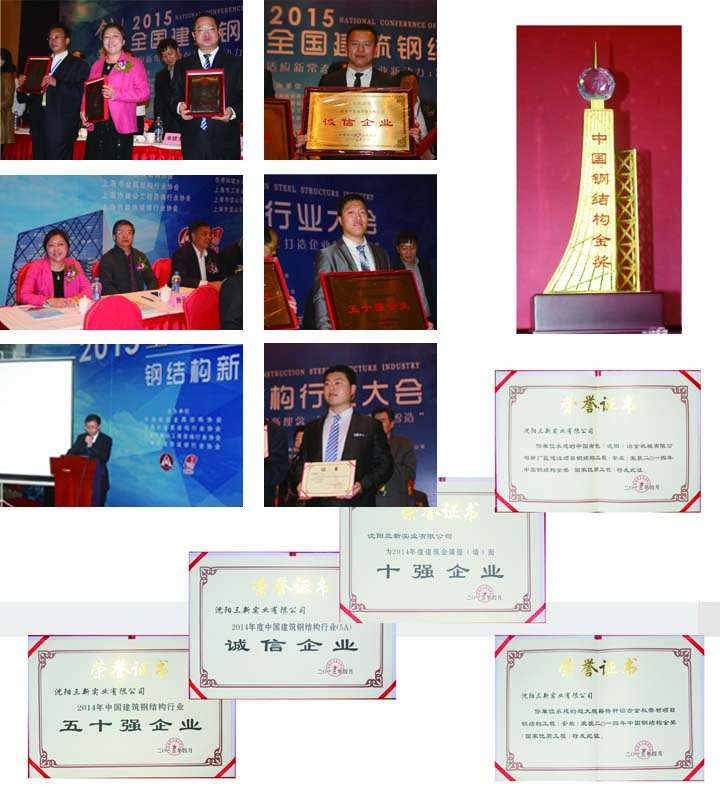 本屆大會是表彰盛會,它被譽為鋼結構行業的“東方奧斯卡盛典”共有十二個獎項在此頒發。三新集團董事長兼遼寧省建筑金屬結構協會會長于東云率團參加了本次大會,并做了主旨演講。公司工程部高剛部長在“鋼結構新技術、新產品交流會”上介紹并展示了公司的新技術新產品。公司承建的中國有色(沈陽)冶金機械新廠區建設項目、中鋁集團東北輕合金有限責任公司超大規模特種鋁合金板帶材項目及優化特種鋁合金板帶材產品結構配套項目分獲第十一屆第二批“中國鋼結構金獎”。同時公司還獲得2014年度“中國建筑鋼結構誠信企業(5A)”企業、“2014年度全國鋼結構行業50強企業”、“2014年度金屬屋墻面行業十強企業” 稱號,于東云董事長榮獲“2014年度全國鋼結構行業優秀企業家” 稱號、王國臣榮獲 “2014年度全國鋼結構行業優秀車間主任”稱號、吳龍榮獲“2014年度行業協會優秀工作者” 稱號。公司還派團參加了“2015年鋼結構龍頭企業業績及配套產品展覽會”,公司及產品得到參會客商的良好評價。