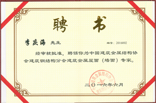 近日獲悉,我公司總工程師李慶海被聘為中國建筑金屬結構協會鋼結構分會建筑金屬墻面(屋面)專家。