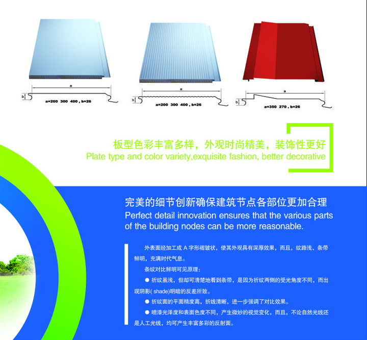 SX-400幕墻板創新的節點結構,獨特的安裝方式,確保外墻的墻面、墻角全無釘。使用三新工業金屬幕墻板建筑外墻,整潔、美觀,可以達到理想的建筑表面裝飾效果。科學嚴謹的項目管理工作是確保工程安裝能真實地符合三新集團金屬建筑系統技術體系要求的根本保障。