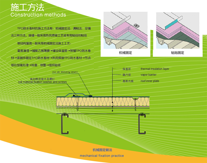 為確保卷材防水層在屋面的整體性,關鍵之一是搭接處理,通過熱焊接使相鄰卷材搭接形成高于卷材強度的粘結層,形成卷材整體的連續密封防水層。 TPO卷材與屋面的固定方式: